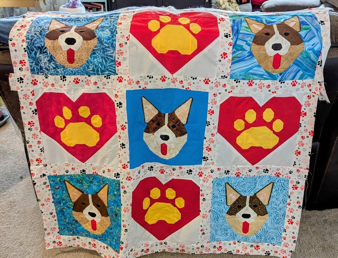 Corgi cuddles in quilt form! This pup-tastic pattern lets you sew a playful Welsh Corgi block for your next project. Perfect for any dog lover's home (bonus points for corgi moms!).